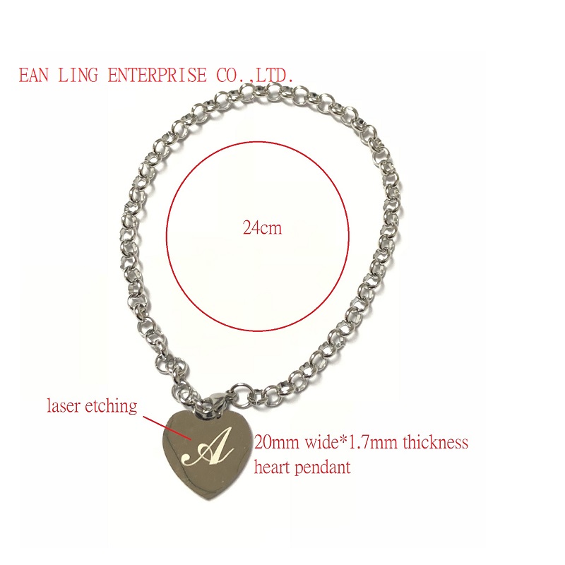 Stainless steel heart pendant anklet with "A" English letter logo. Application Simple chains and heart shaped pendant with laser etching English letter "A",